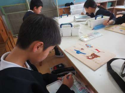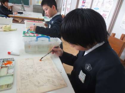 板にデザインを描き、絵の具で色をつけます。