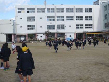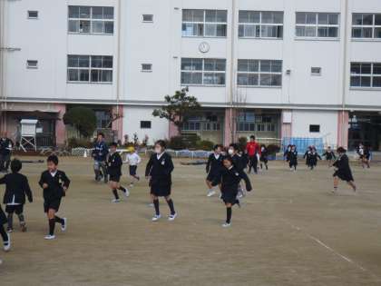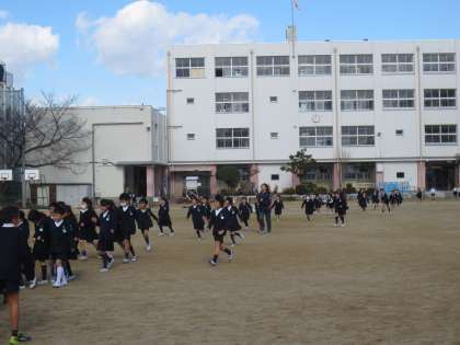 校舎から運動場にでて、走って一次避難の隊形に整列します。どの子どもも真剣に避難訓練をしています。
