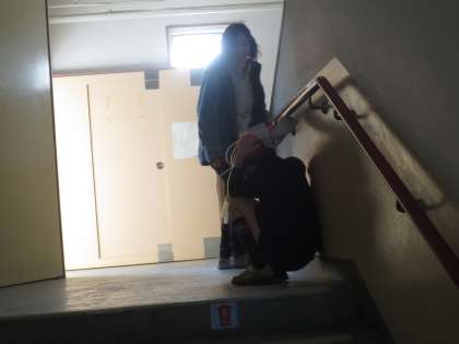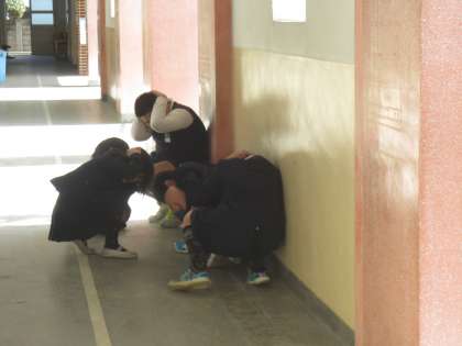 階段や廊下にいる子どもたちは、近くの安全な場所でしゃがんで待ちます。そして、教頭先生が「地震のゆれがおさまりました」「一次避難を開始します」の指示をします。