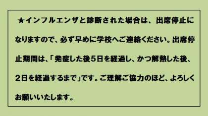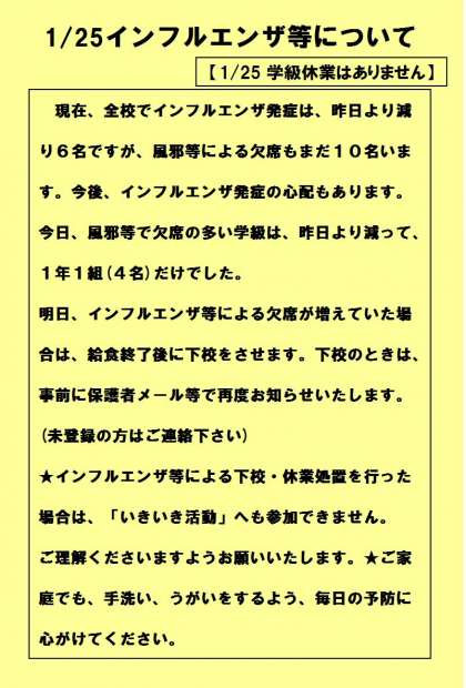 【1/25学級休業はありません】現在、全校でインフルエンザ発症は、昨日より減り6名ですが、風邪等による欠席もまだ10名います。今後、インフルエンザ発症の心配もあります。今日、風邪等で欠席の多い学級は、昨日より減って、1年1組(5名)だけでした。明日、インフルエンザ等による欠席が増えていた場合は、給食終了後に下校をさせます。下校の場合、保護者メール等でも再度お知らせいたします。★インフルエンザ等による下校・休業処置を行った場合は、「いきいき活動」へも参加できません。ご理解くださいますようお願いいたします。★ご家庭でも、手洗い、うがいをするよう、毎日の予防に心がけてください。
