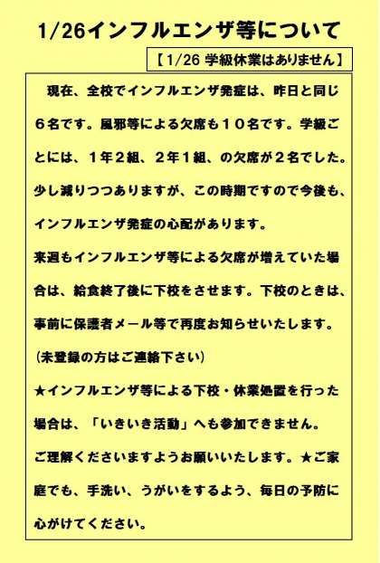 【1/26学級休業はありません】現在、全校でインフルエンザ発症は、昨日と同じ6名です。風邪等による欠席も10名です。学級ごとには、1年2組、2年1組、4年2組で風邪等の欠席が2名でした。少し減りつつありますが、この時期ですので今後もインフルエンザ発症の心配があります。来週もインフルエンザ等による欠席が増えていた場合は、給食終了後に下校をさせます。下校の場合、保護者メール等でも再度お知らせいたします。★インフルエンザ等による下校・休業処置を行った場合は、「いきいき活動」へも参加できません。ご理解くださいますようお願いいたします。★ご家庭でも、手洗い、うがいをするよう、毎日の予防に心がけてください。
