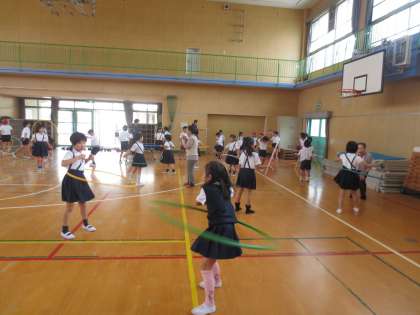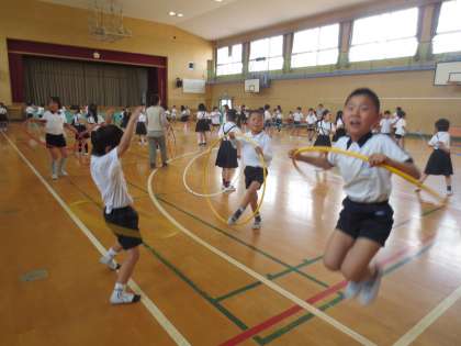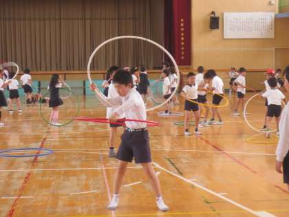 子どもたちは腰でまわす以外に、フラフープを使って色々な遊びを工夫していました。