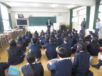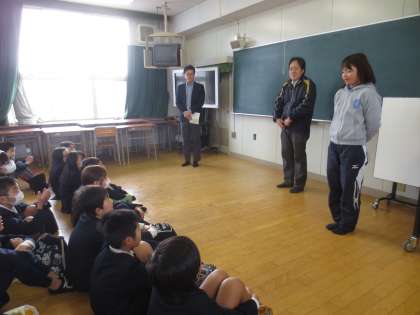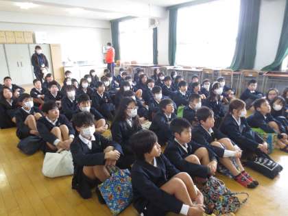 6年生が新巽中学校で体験授業をしていただきました。全体で説明をきき、学級ごとに体験授業を受けます。子どもたちは少し緊張気味です。
