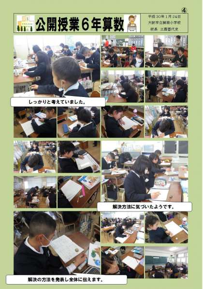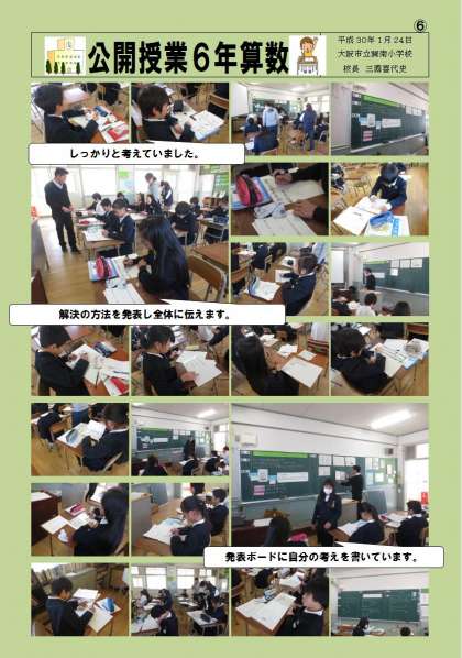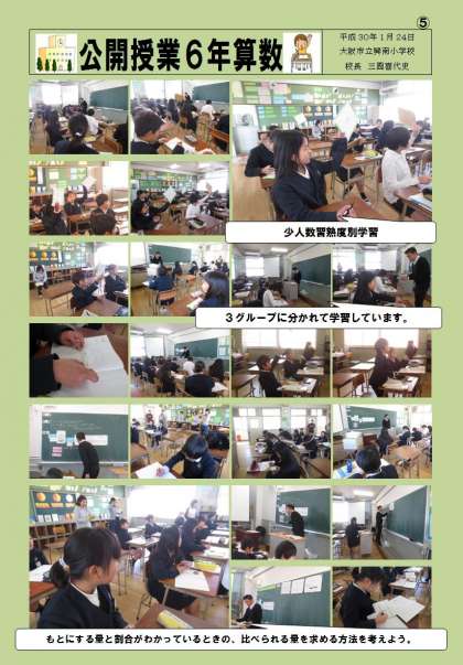 6年生の算数科、少人数習熟度別での学習です。授業を参観することで教員相互が学び教え合います。右記の配布文書に様子を載せております。ご覧下さい。