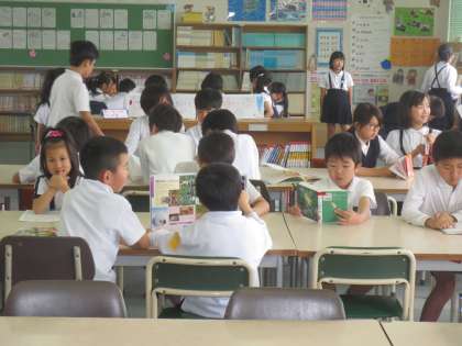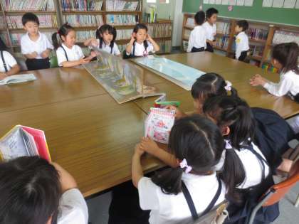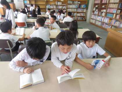 真剣に読んでいる子、友だちと仲良く読んでいる子、好きな本を探している子などで、図書館は楽しい学習の場になっています。