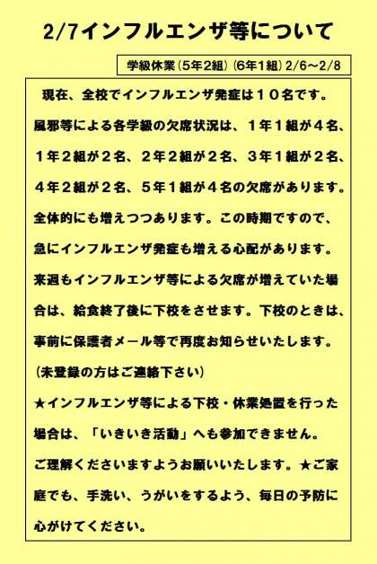 【学級休業2/6〜2/8 (5年2組)(6年1組)】現在、全校でインフルエンザ発症は10名です。風邪等による各学級の欠席状況は、1年1組が4名、1年2組が2名、2年2組が2名、3年1組が2名、4年2組が2名、5年1組が4名の欠席があります。全体的にも増えつつあります。この時期ですので、急にインフルエンザ発症も増える心配があります。