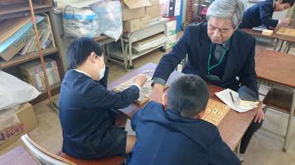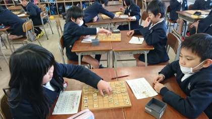 巽南放課後将棋クラブです。子どもたちは将棋が大好きです。指導をしていただいているのは、巽南第6振興町会会長の諸富眞澄さんです。