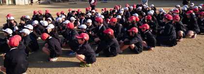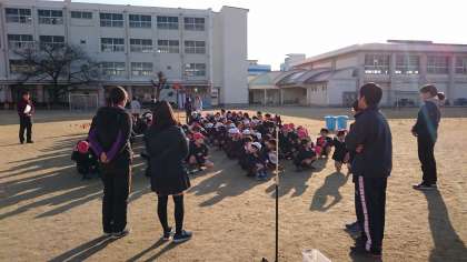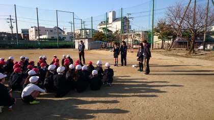 3・4年生がペアになり集会活動をしています。集会委員会の児童が、「紅白玉入れ」競技の説明をしています。