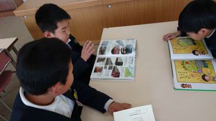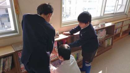 教室でも本が好きな子どもは、休み時間も読書をしています。図書館にやってきて、新しい本が入っているかな〜あと、本棚をさがしている子どもたちもいます。