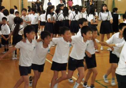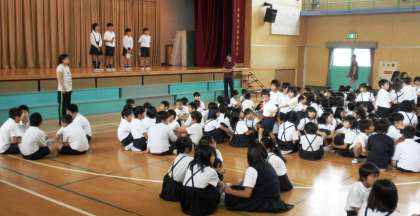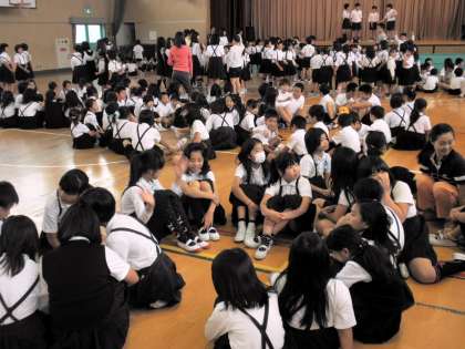 1年生から6年生までの全員が仲良くグループに分かれて円になって座ります。
