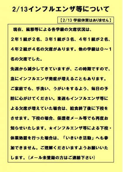 【2/13学級休業はありません】現在、風邪等による各学級の欠席状況は、2年1組が2名、3年1組が3名、4年1組が2名、4年2組が4名の欠席があります。他の学級は0〜1名の欠席でした。先週から減少してきていますが、この時期ですので、急にインフルエンザ発症が増えることもあります。ご家庭でも、手洗い、うがいをするよう、毎日の予防に心がけてください。