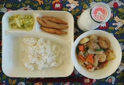 わかさぎフライ、一口がんもとじゃがいもの煮もの、あっさりキャベツ、ご飯、牛乳