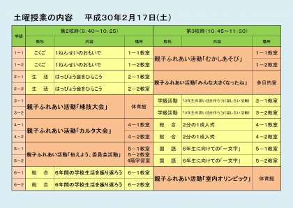 先日ご案内いたしました土曜授業の取組内容をお知らせいたします。学習参観と親子ふれあい活動は下記の内容で実施します。一年間のお子さんの成長ぶりをご覧いただくよい機会かと思います。また、「親子ふれあい活動」で、親子でゲームやスポーツなどを行い、楽しいひと時にしていただければと考えております。お忙しい時期ではございますが、ご来校くださいますようご案内申しあげます。