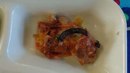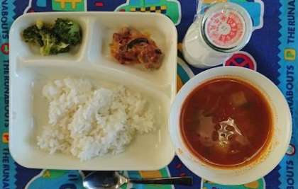 鶏肉とチーズのカラフル焼き、野菜のミネストローネ、ブロッコリーのサラダ、ご飯、牛乳