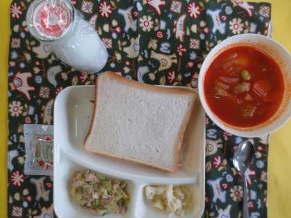 ミートボールと野菜のケチャップ煮、ツナと野菜のソテー、カリフラワーのレモン風味サラダ、食パン、りんごジャム、牛乳