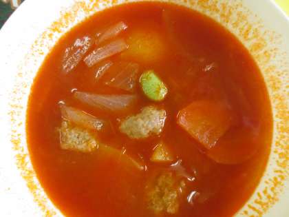 肉だんご、じゃがいも、たまねぎ、にんじん、枝豆の入ったケチャップ味の煮ものです。