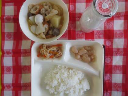 関東煮、甘酢あえ、大福豆の煮もの、ご飯、牛乳