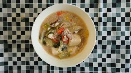 豚肉、とうふを主材に、はくさい、たまねぎ、チンゲンサイ、にんじん、しいたけの入った煮物です。