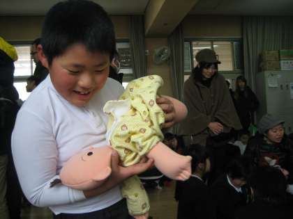 体験として実際に産道を通ったり、赤ちゃん人形をだっこ