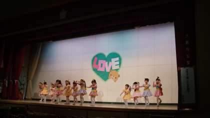 すみれ組の遊戯(あしたも笑顔で)です。しっかりと音楽に合わせてとても可愛く踊っていました。