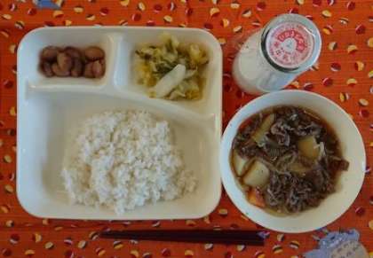肉じゃが、はくさいの甘酢づけ、とら豆の煮もの、ご飯、牛乳