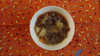 牛肉、じゃがいも、たまねぎ、にんじん、グリンピースの入ったいろどりのよい煮ものです。児童に好評のメニューです。
