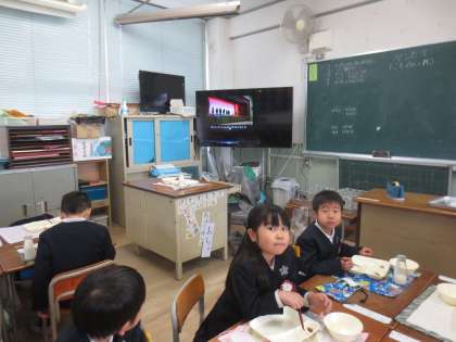 今日もビデオ放送で学校保健委員会2/22(木)の様子を、給食時間に見てもらいました。テーマは、「みんなでたのしく 歯っ歯っ歯っ!なんてったって健康一番」です。健康には歯が大切であることを、しっかりと理解してほしいです。