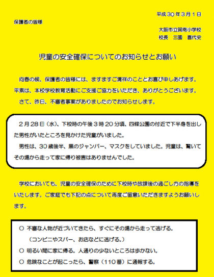 2月28日(水)、下校時の午後3時20分頃、四條公園の付近で下半身を出した男性がいたところを見かけた児童がいました。男性は、30歳後半、黒のジャンパー、マスクをしていました。児童は、驚いてその場から走って家に帰り被害はありませんでした。学校においても、児童の安全確保のために下校時や放課後の過ごし方の指導をいたします。ご家庭でも下記の点について再度ご留意いただきますようお願いします。●不審な人物が近づいてきたら、すぐにその場から走って逃げる。(コンビニやスパー、お店などに逃げる)●明るい間に家に帰る。人通りの少ないところは歩かない。●危険なことが起こったら、即、警察(110番)に通報する。