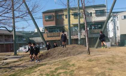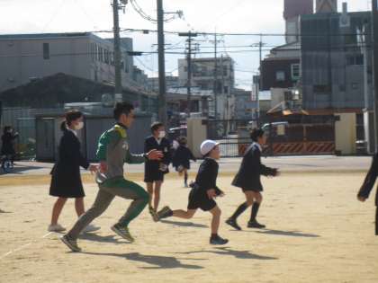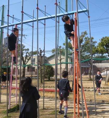 先生と鬼ごっこ遊びをしていました。のぼり棒にもチャレンジしています。
