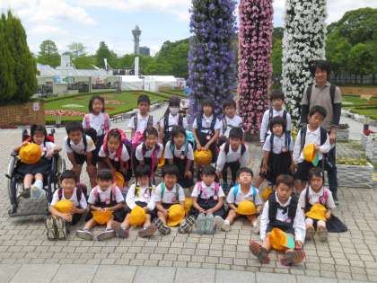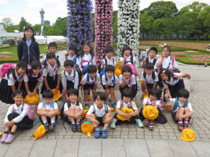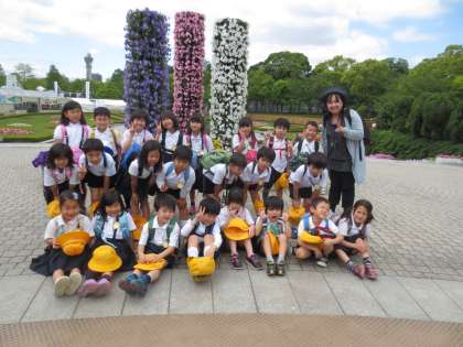楽しかった動物園を出て、記念撮影をしました。後ろには通天閣が見えます。