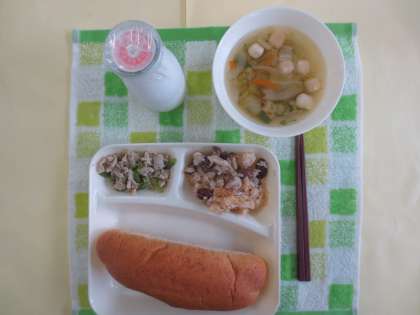 豚肉とピーマンのいためもの、すまし汁、金時豆のおこわ、ライ麦パン、牛乳