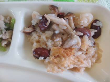 金時豆、鶏肉、うすあげ、しめじの入ったおこわです。もち米でもちもちした仕上がりです。