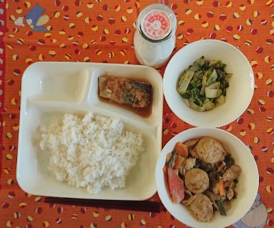 さばのおろしじょうゆかけ、一口がんもとさといものみそ煮、はくさいのごまあえ、ご飯、牛乳