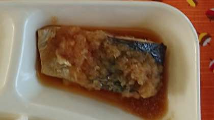 しょうが汁、料理酒、で下味をつけ焼いたさばに、みりん、こいくちしょうゆで味付けした、だいこんおろしをかけていただきます。ご飯に合うおかずです。