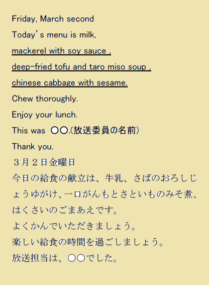 毎週金曜日、給食の時間に英語で献立を紹介します。まず放送委員会の児童が英語で・・・そのあと、英語のカーン先生が同じ献立を英語で紹介します。