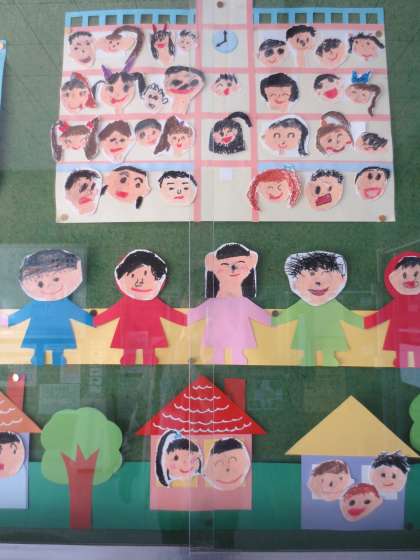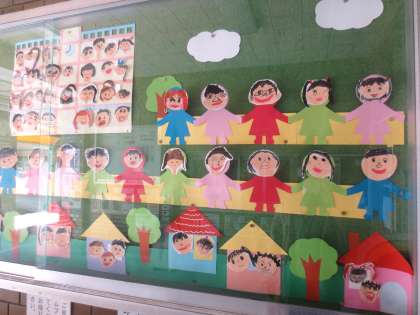 子どもたちが手をつなぎ、仲よく学校で過ごしている玄関掲示です。子どもたちが作っています。