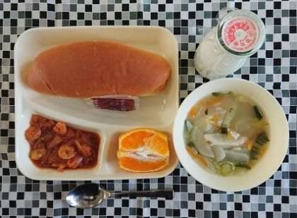 えびのチリソースいため、中華がゆ、デコポン、コッペパン、いちごジャム、牛乳