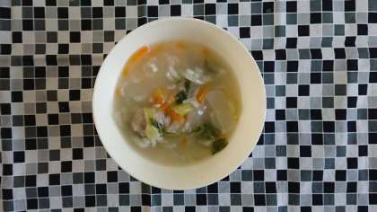 肉だんご、だいこん、チンゲンサイ、にんじんの入った中華がゆです。ごま油で風味を増しています。
