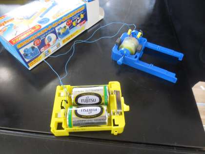 ニクロム線コイルに電流が流れ、すごい速さでモーターが回っています。