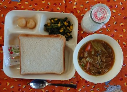 豚肉と野菜のカレー煮、ほうれん草のソテー、あげポテトもち、食パン、りんごジャム、牛乳
