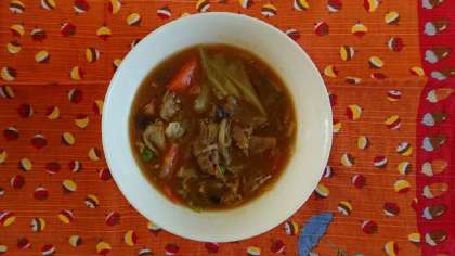 豚肉、キャベツ、たまねぎ、にんじん、グリンピース、しめじを使った、カレー味の煮物です。