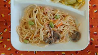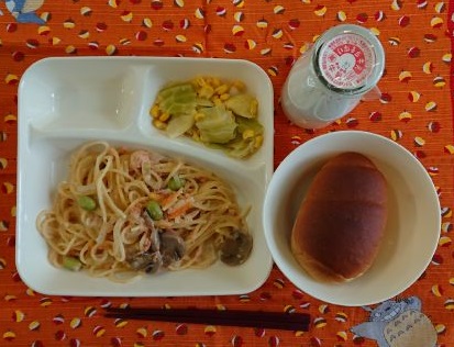 さけのクリームスパゲッティ、キャベツとコーンのサラダ、黒糖パン小、牛乳