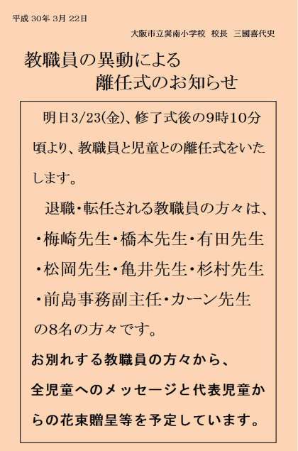 明日3/23(金)、修了式後の9時10分頃より、全児童とのお別れ式(離任式)をいたします。お別れする教職員の方々から全児童へのメッセージ、児童代表からの花束贈呈等を予定しています。遅くなりましたがご連絡いたします。退職・転任される教職員の方々は、梅崎先生・橋本先生・有田先生・松岡先生・亀井先生・杉村先生・前島事務副主任・英語指導のカーン先生の8名の方々です。