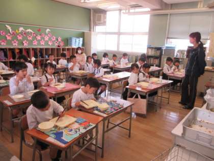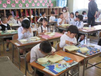 1年2組の給食の時間の様子です。少しずつ慣れてきました。みんなしっかり食べています。