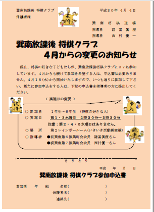 巽南放課後将棋クラブが今週水曜日から始まります。昨年度から続けて参加の人は申し込みは必要ありません。新たに参加申し込みをする人は申し込み書を指導者の方に提出してください。(申込書は職員室にもあります。)