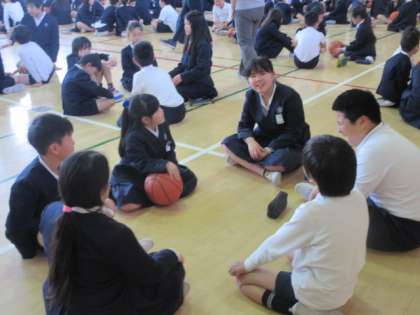 桑原先生の指導のもと、「ゴロ・ピカ・ドカン」ゲームをしています。先生が「ゴロゴロ…」と言っている間は、どんどんボールを右の人に渡します。「ピカピカ…」と言い出したら、反対向きにボールを渡していきます。そして、「ドカン!」と言った時に、ボールを持っている人が、自己紹介(名前やクラス、好きな食べ物など)をします。楽しくゲームをしながら、班の人のことを知ることができます。