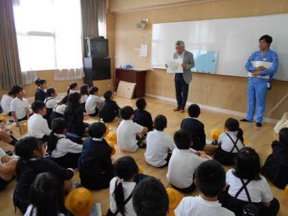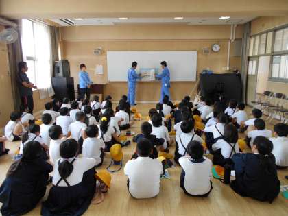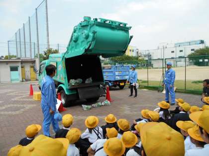 4月23日、4年生の出前授業で、東部環境センターからパッカー車が来校しました。間近で見るパッカー車の迫力に興味津々の4年生でした。多目的室の授業では、「地域ごみ0リーダー」の第6町会長の杉山さんにもご参加いただき、楽しいクイズを通して、ごみの分別や方法について学ぶことができました。