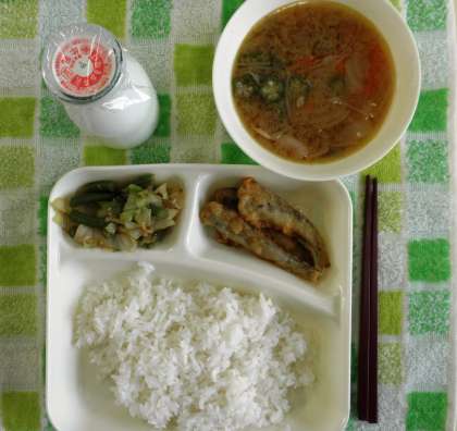 いわしてんぷら、みそ汁、キャベツと三度豆のごまあえ、ご飯、牛乳