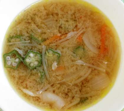 たまねぎ、もやし、にんじん、オクラなどの入ったみそ汁です。