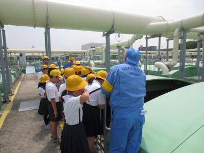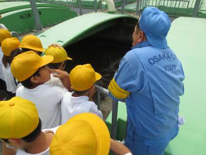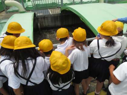 汚れた水が酸素と微生物の働きにより、きれいな水になっていく様子を見学しています。子どもたちは、微生物の力のすごさに感心していました。